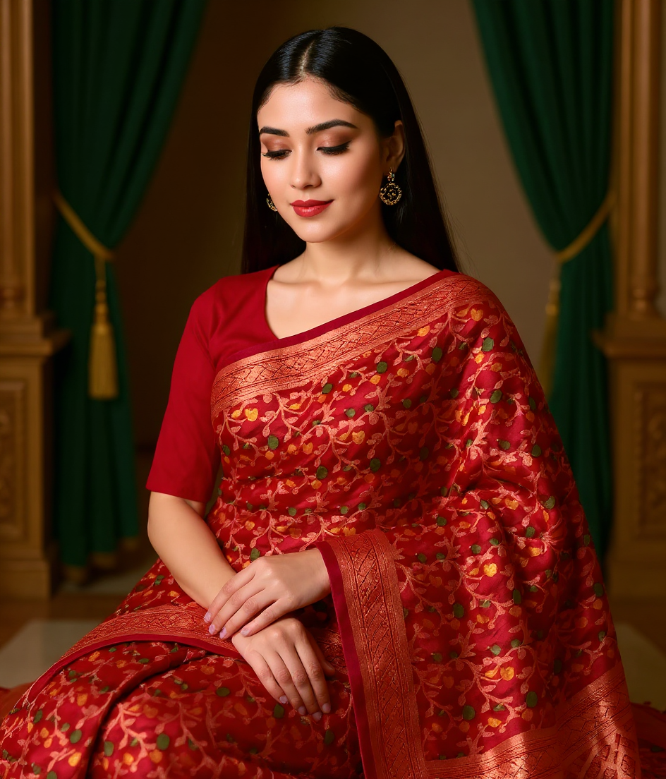 | Work/Weave | Zari-woven butti all over; gold border; brocade pallu |