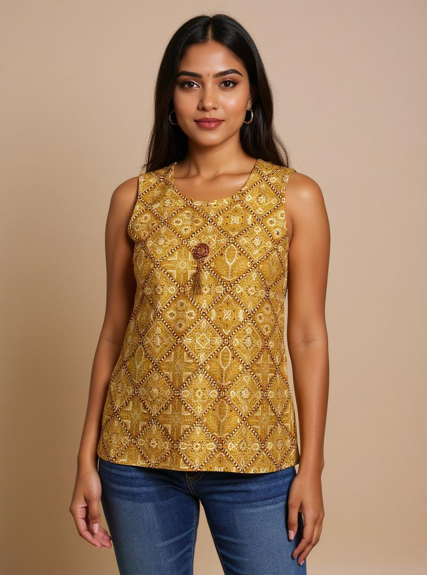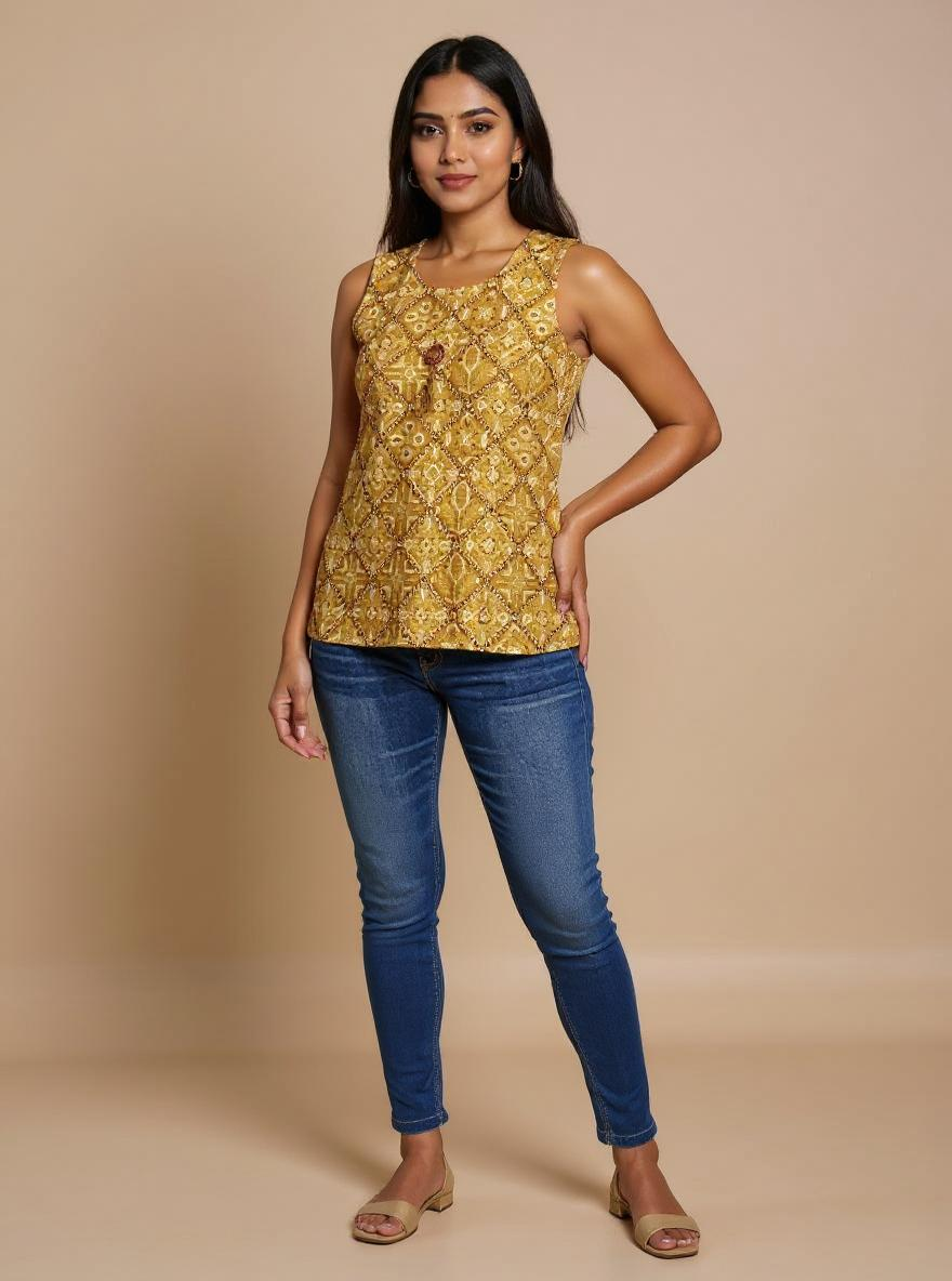 Refresh your everyday style with the vibrant charm of our Desert Gold Bandhani Sleeveless Kurti. Intricate geometric motifs across a rich mustard-yellow canvas, while a delicate wooden tassel at the neckline adds a touch of boho flair. Cut from breathable, lightweight cotton, this hip-length kurti drapes in a straight silhouette that flatters every body type and keeps you cool all day long.
