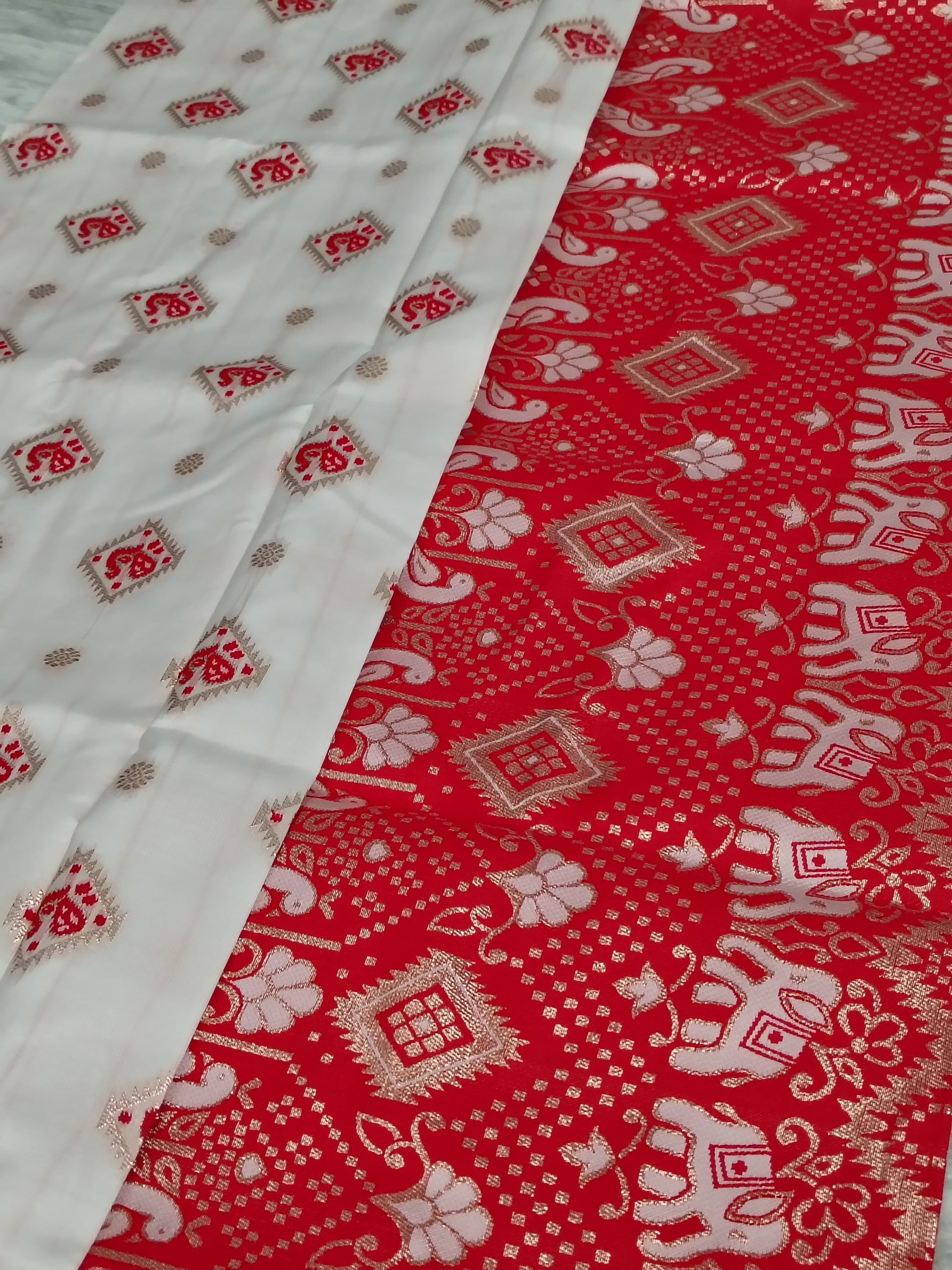 Step into timeless elegance with this stunning White Tussar Silk Saree. The beautiful white base is adorned with intricate red and golden woven motifs, giving it a royal and festive charm. The rich red pallu with golden floral and elephant patterns makes it a perfect pick for weddings, festivals, and special occasions.