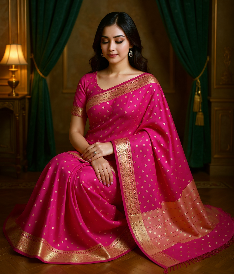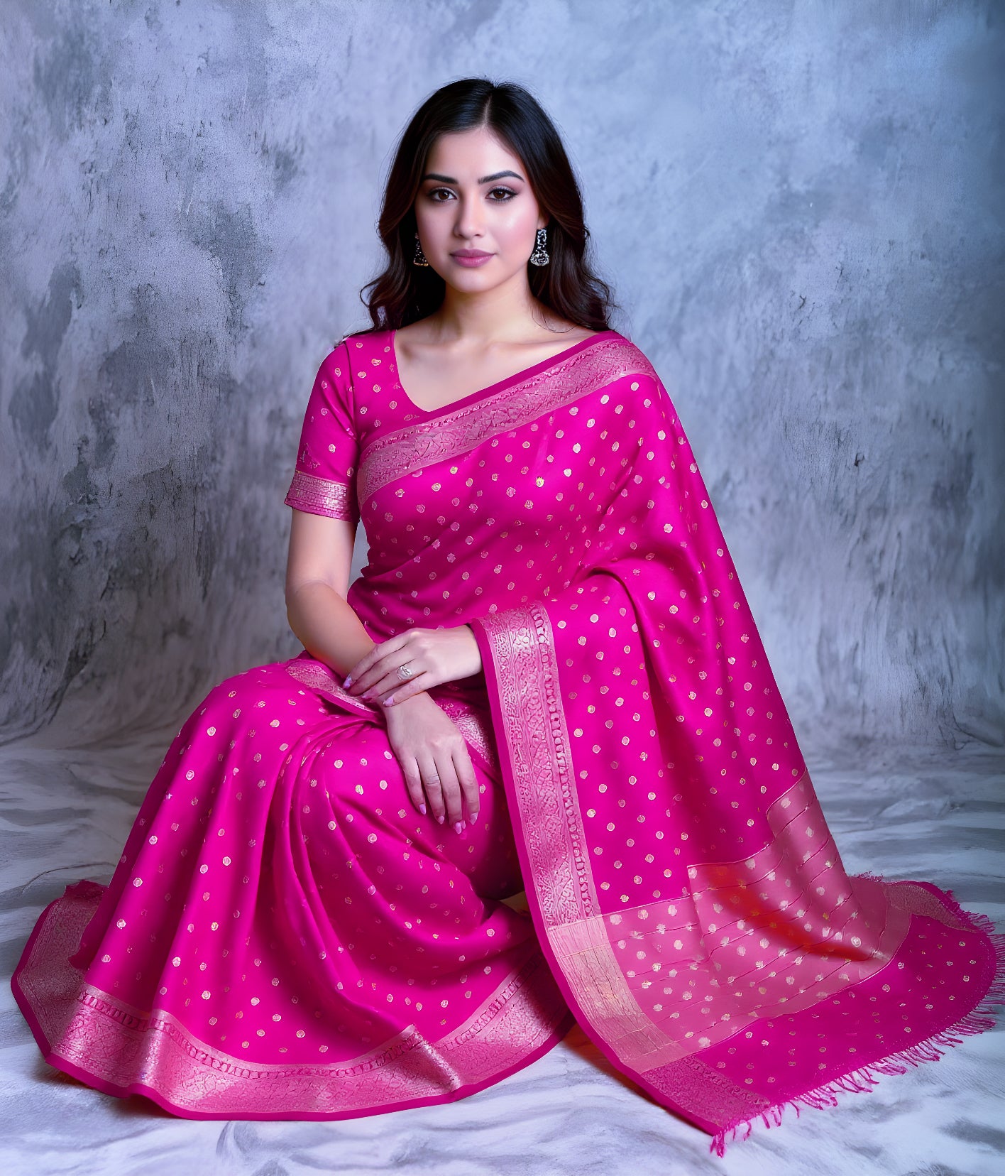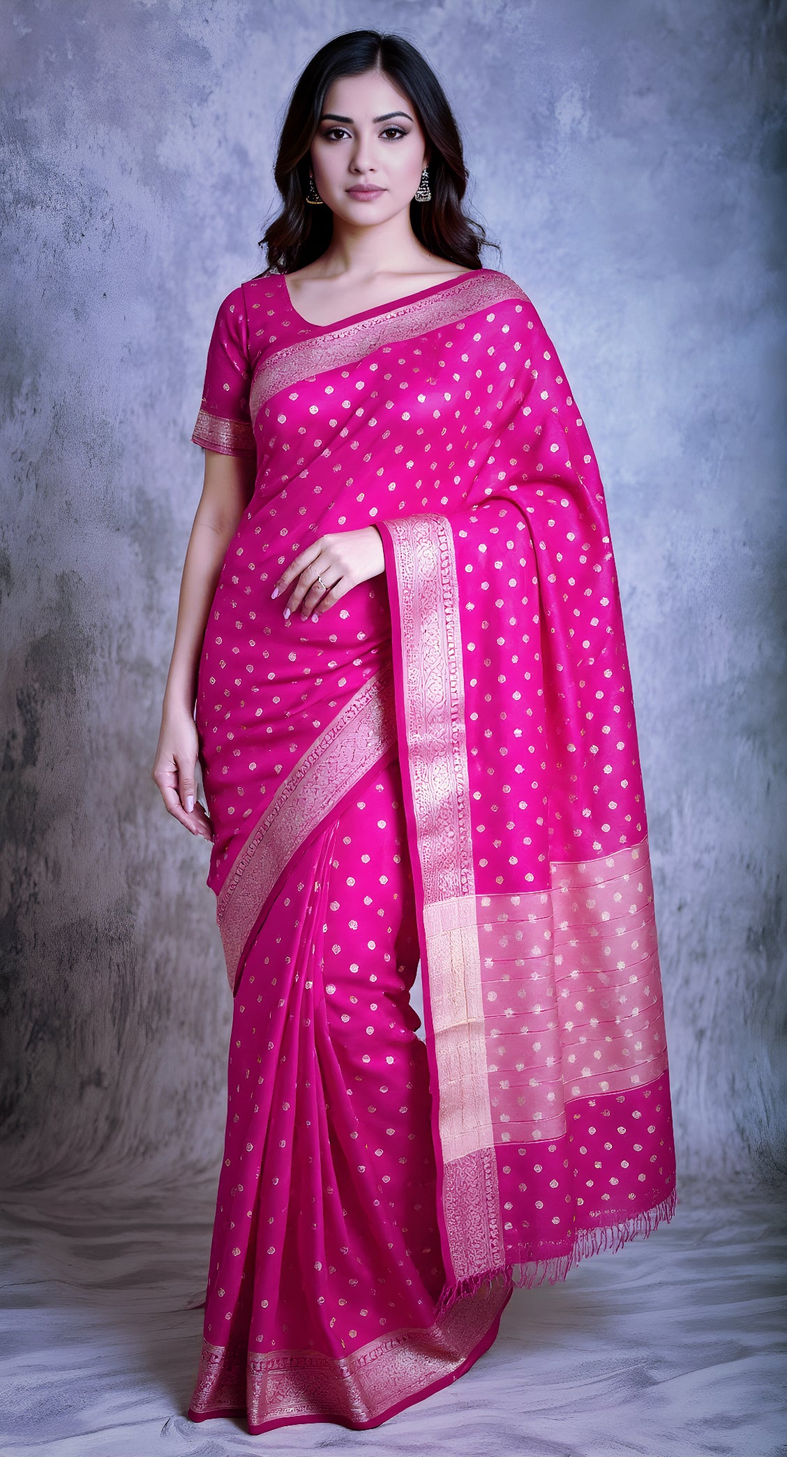 Bring home the charm of timeless tradition with this Radiant Pink Raw Antique Zari Saree, crafted in premium Art/Fancy Silk. The luxurious golden zari weaving over the vibrant pink base makes it a perfect choice for weddings, festive occasions, and celebrations. The rich border and intricate pallu design add an elegant touch, while the soft silk fabric ensures a comfortable drape all day long.