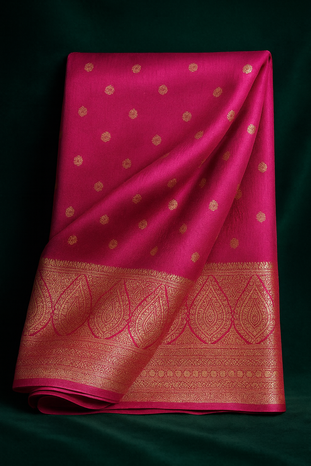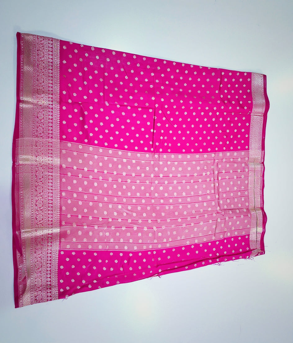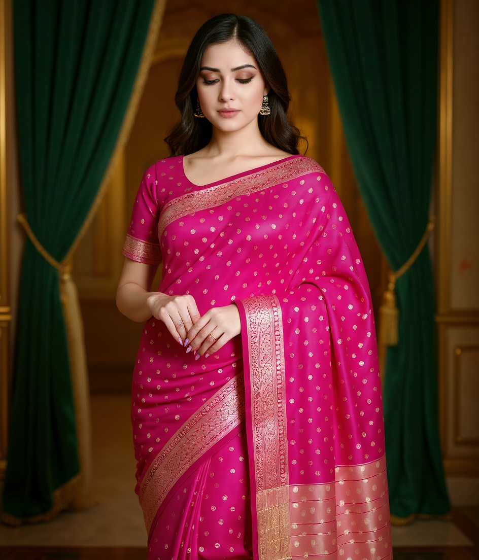 Bring home the charm of timeless tradition with this Radiant Pink Raw Antique Zari Saree, crafted in premium Art/Fancy Silk. The luxurious golden zari weaving over the vibrant pink base makes it a perfect choice for weddings, festive occasions, and celebrations. The rich border and intricate pallu design add an elegant touch, while the soft silk fabric ensures a comfortable drape all day long.